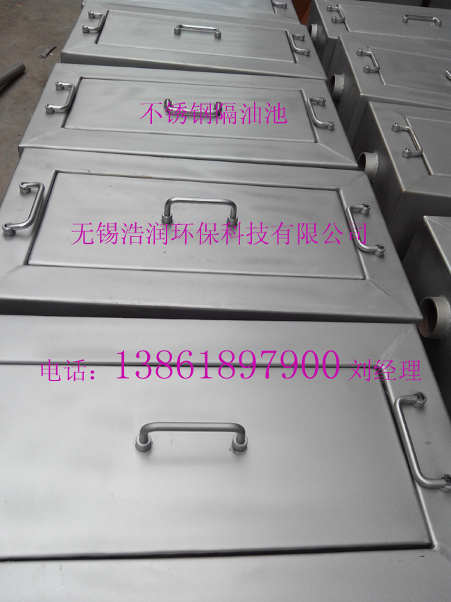 不锈钢隔油池采用的是不锈钢材质,它的内部是由油脂阻集室、残渣阻集个其他配件构成,这种隔油池就是通过残渣阻集室,留下固体物质,污水经过隔板下缘流入油脂阻集室,经重力分离大量油脂浮于表面,脱油污水经隔板下缘流入油脂阻集室,油脂再次分离上浮表层,脱油污水出口流入国家环保局规定的统一规范的净水采样室,便于采样,经排放管排出。整体的过程直接将油污去除掉,实现污水顺利的排放到下水管道,既安全又实用。
